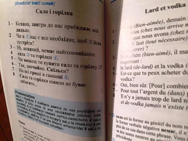 "Друг купив собі курс вивчення української мови. Усцикаємося весь вечір. Після цілком притомної вступної частини, де французам пояснюються всі біди, що ставалися за останні століття з нашою мовою, і де обіцялися подробиці української літератури, мистецтва і щоденного життя українців, ідуть отакі діалоги. На повторення, чьо) Бикотєка фор ева) імідж ніщо" ,- написала Карпа.