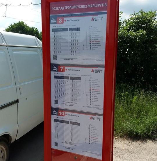 "Перед цим Sergii Gavryliuk встиг оновити макет, додавши туди лінії пересадкових вузлів по кожній наступній зупинці та QR-код (він спрямовує під час сканування на офіційну сторінку КП "ЕАТ" у Фейсбуці). Наразі цей макет затверджуємо вже на постійну основу, до 19 липня, як і обіцяли - решта 35 зупинок отримають свої футляри із графіками", - йдеться у дописі.
