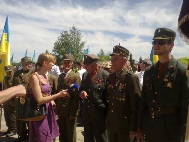 Священик починає панахиду. Всі шикуються у шеренгу. Поряд із учасниками визвольної боротьби — школярі та студенти, які представляють Всеукраїнську скаутську організацію «Пласт».