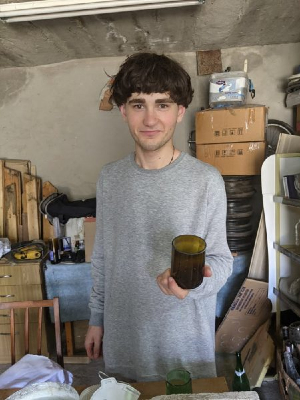 Йому 18 років, виглядає втомленим. Щойно прибіг із радіоефіру, а перед тим була робота. Олег працює з 15 років. Заробивши грошей, хлопець зміг їх потім вкласти в обладнання для переробки скляних пляшок.
