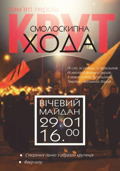 29 січня - заходи, приурочені 97 річниці пам’яті Героїв Крут. 17.00 – молодіжна смолоскипна хода за маршрутом: Вічевий майда — вул. Незалежності — С. Бандери — Меморіальний сквер. 17.20 – панахида на вшанування пам'яті героїв Крут, віче. Меморіальний сквер. До участі запрошуються молодіжні громадські організації.