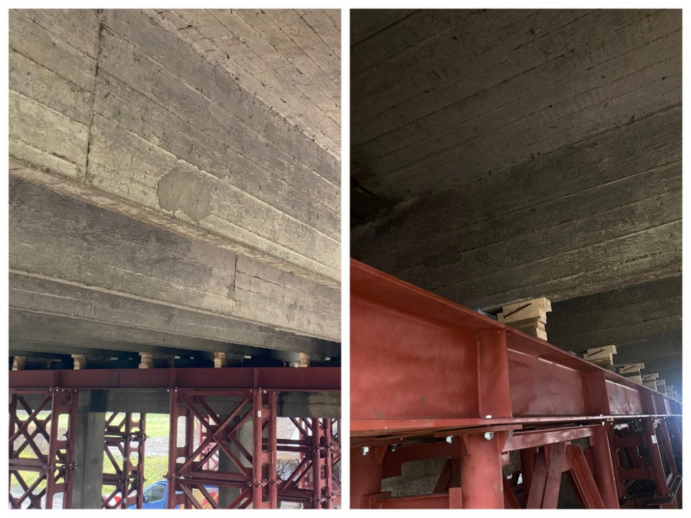 Він уточнив, що дерев’яні клини з лісоматеріалу м’яких порід, об’єднані будівельними скобами, є частиною затверджених проєктних рішень. Вони влаштовані поруч із металевою клиноподібною підкладкою та слугують для моніторингу стану прогонової будови та страхувальних опор. Ці елементи дозволяють фіксувати осадку або деформації, якщо з’являється просвіт між балкою та підкладкою, це вказує на зміни, що вимагають негайного огляду та регулювання металевої підкладки.
