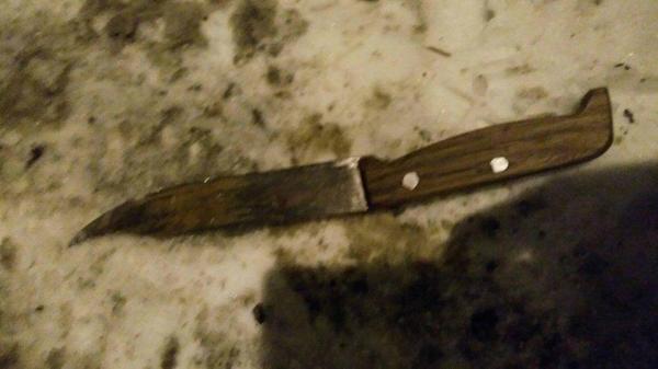 Правоохоронці відібрали у дідуся ніж та одягнули на руки кайданки. Цікаво, що ніж, схоже, був виготовлений кустарно із широкого полотна до ножівки.