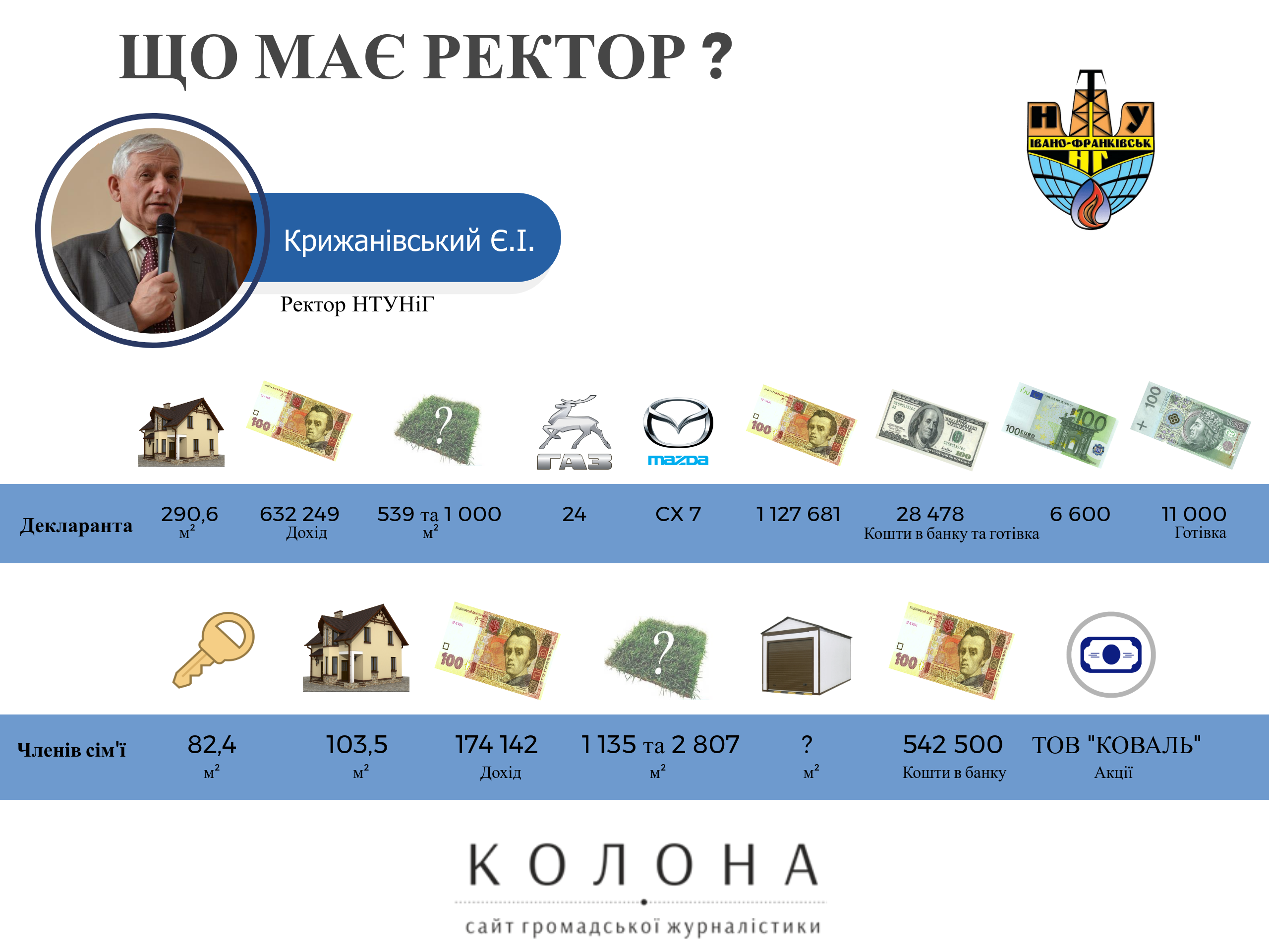 Сайт громадської журналістики проаналізував декларації ректорів державних університетів Прикарпаття. У двох з трьох керівників університетів Прикарпаття в деклараціях вказані кооперативні права у вигляді акцій. Найбільшими статками володіє ректор університету нафти і газу Євстахій Крижанівський.