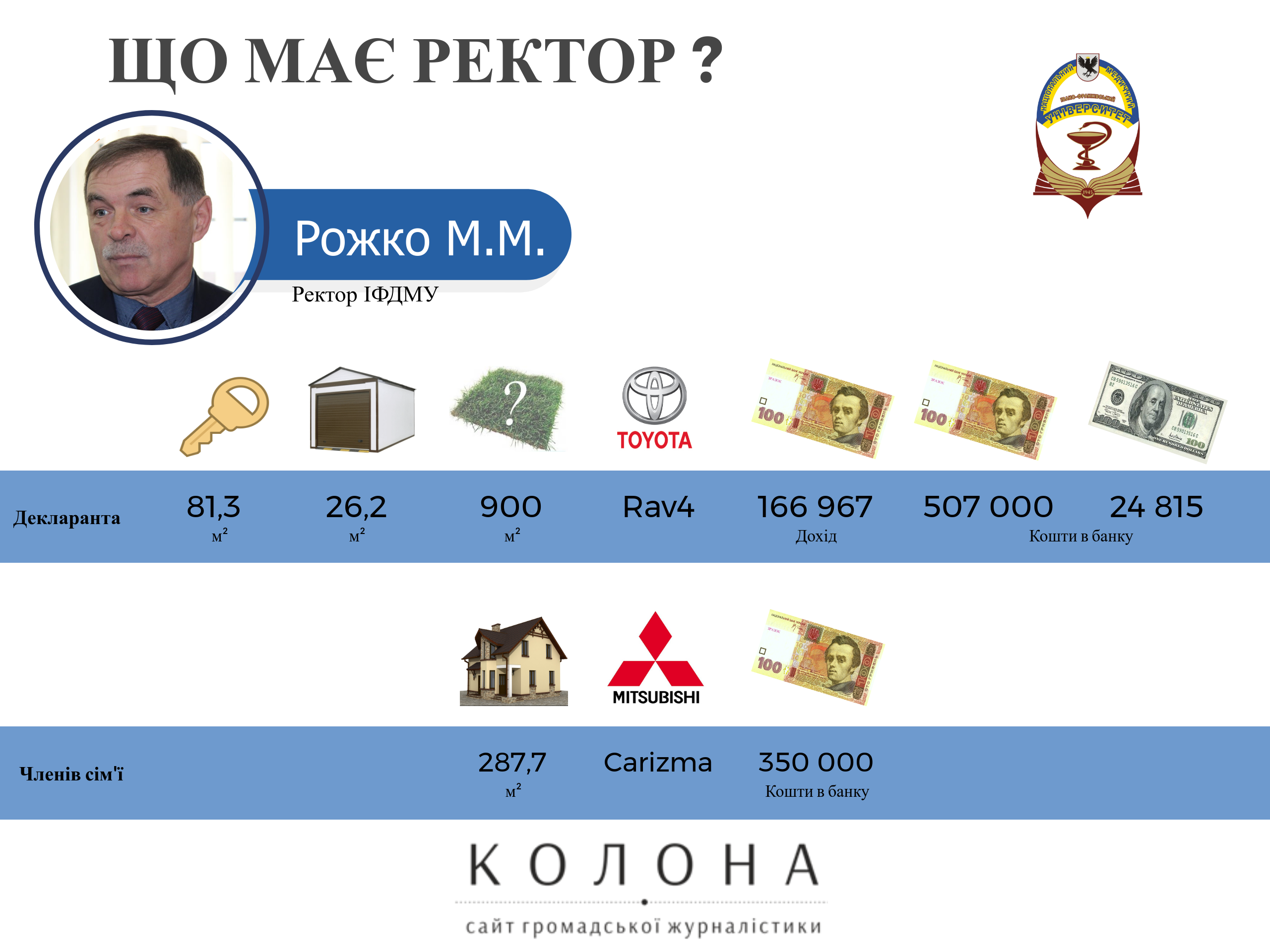 Ректор Микола Рожко є власником квартири площ ею 81,3 квадратних метри та гаражу площею 26,2 метри квадратних у Івано-Франківську. У селі Микуличин, яке підпорядковується місту Яремче у Миколи Рожко є земельна ділянка площею 900 метрів квадратних .