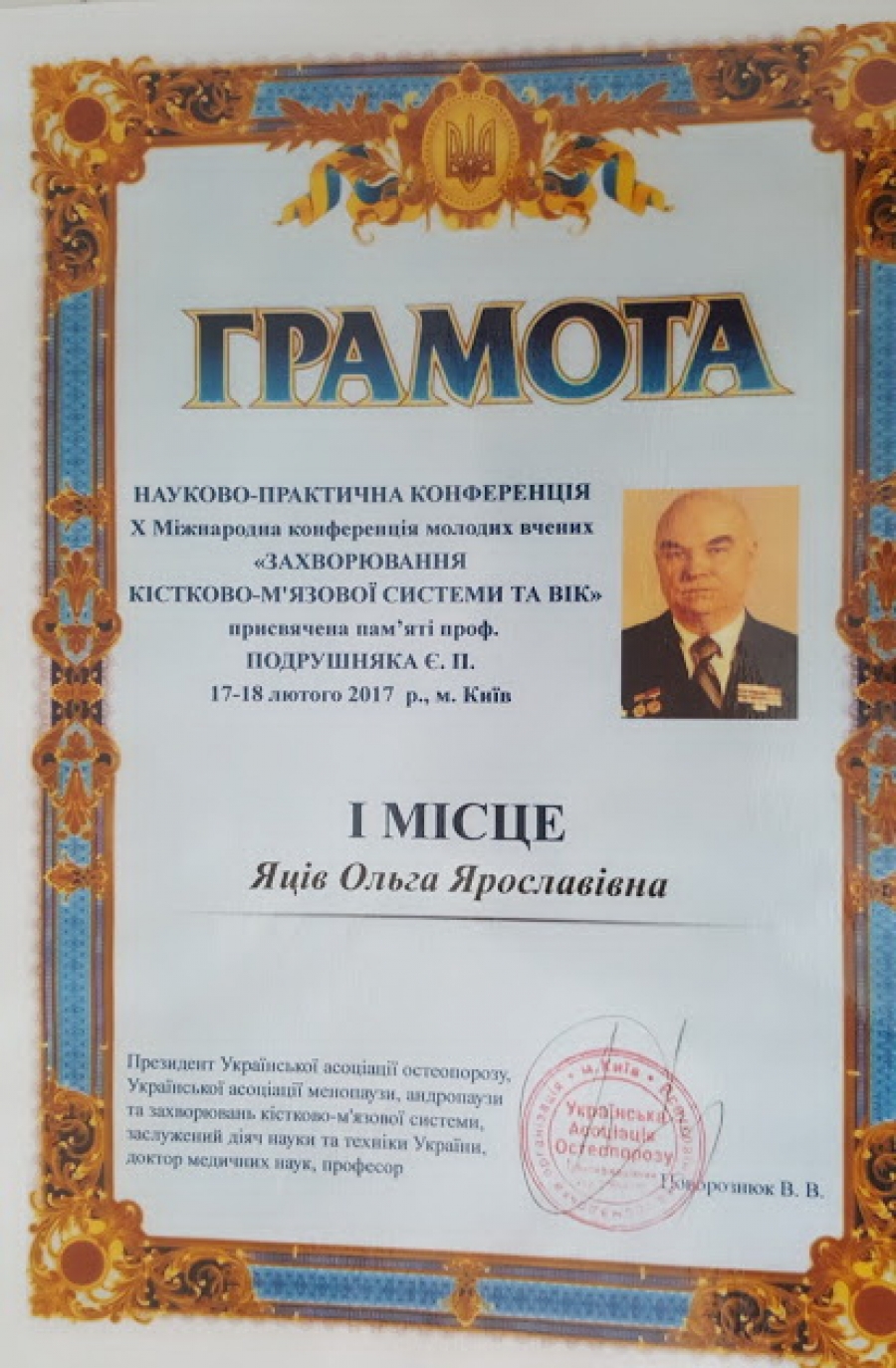 Формат проведення конференції дозволив отримати учасниці кваліфіковану оцінку власних наукових доробок. Призове місце дає можливість зробити подальшу презентацію наукових здобутків призерки на IIІ Міжнародному симпозіумі, присвяченому проблемі захворювань кістково-м’язової системи та віку, який відбудеться цього року.