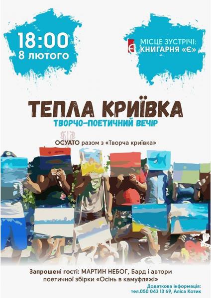 8 лютого о 18.00 в Книгарні "Є" Івано-Франківськ приймає друзів з "Творчої криївки". В програмі - вірші, пісні, подарунки і гарний настрій.