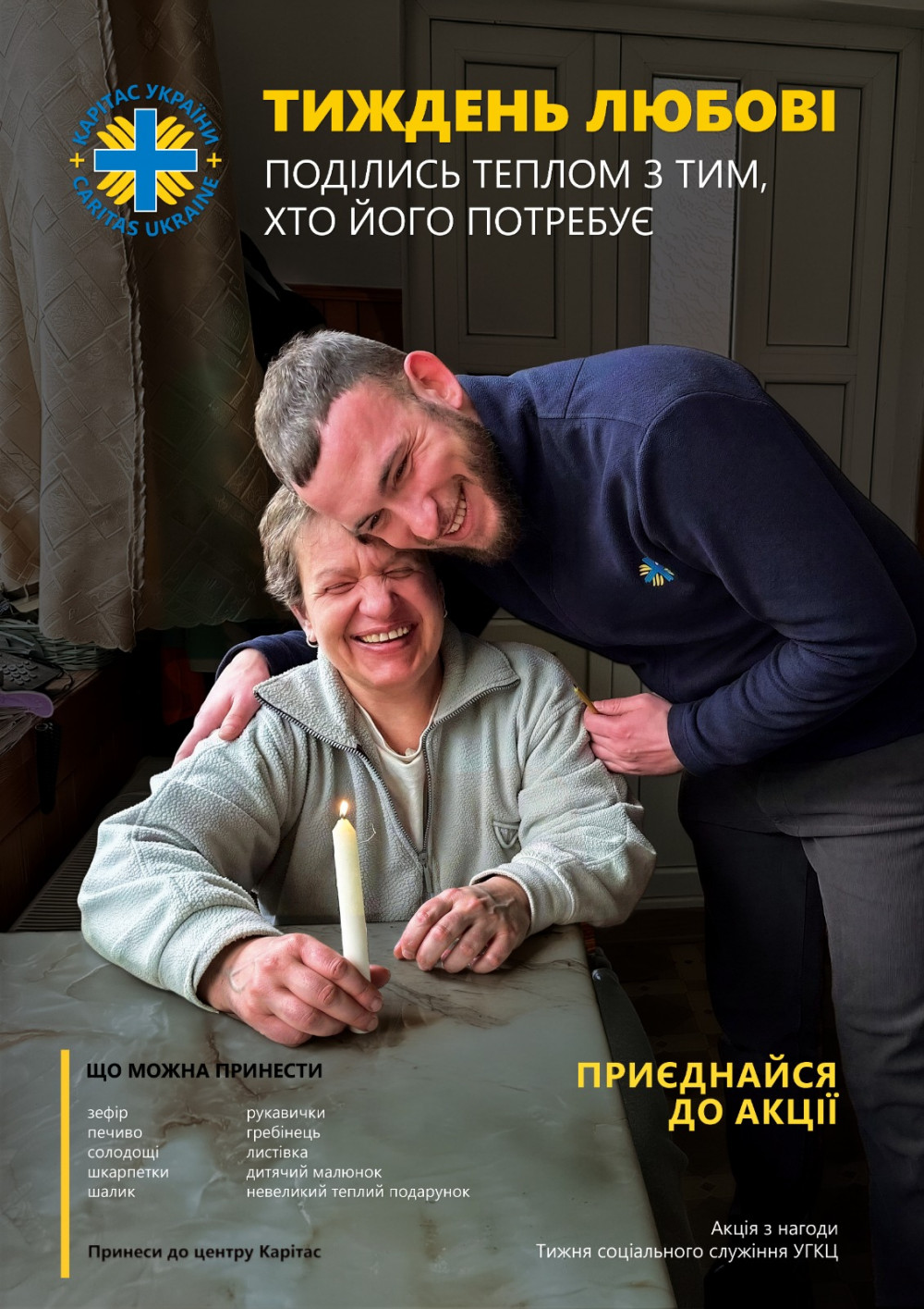 До Карітасу можна принести: солодощі (зефір, печиво), теплі речі (шкарпетки, шалики, рукавички), засоби особистого догляду (гребінці), листівки, дитячі малюнки та інші знаки уваги.