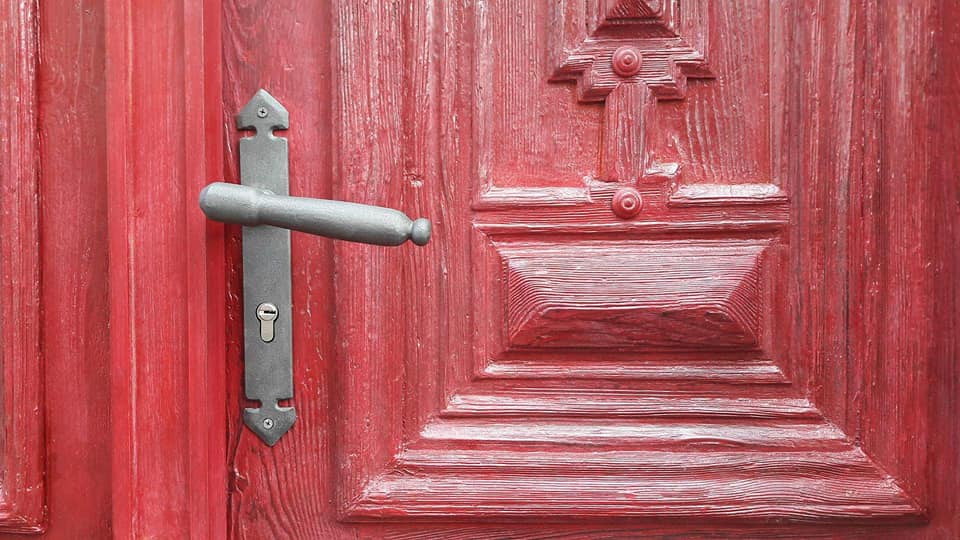 Червоні двері знаходяться в будинку на Труша, 4, що є пам'яткою архітектури 1930-х років. Це дуже оригінальні й, насправді, унікальні для міста металеві двері на найкоротшій і найвужчій вуличці міста з розкішним виглядом на ратушу.