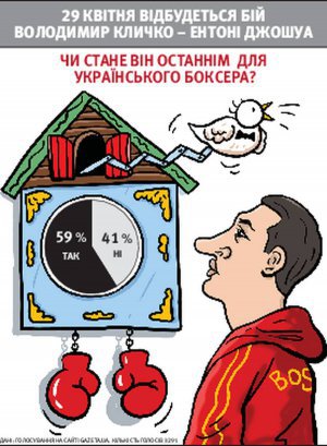 Українець — до бою 64 перемоги, 53 нокаути, чотири поразки, нуль нічиїх — зустрінеться з британцем Ентоні Джошуа, 27 років, — має 18 перемог у 18 поєдинках, усі нокаутом. Змагатимуться за чемпіонський титул за версією Міжнародної боксерської федерації, який належить британцю. А також — за вакантний пояс суперчемпіона Всесвітньої боксерської асоціації. Усі 90 тис. квитків на стадіон "Вемблі" в Лондоні, Велика Британія, продано. Початок бою — 29 квітня о 20:30 на телеканалі "Інтер". Текстова трансляція на gazeta.ua, починаючи з 00:00 30 квітня, пише gazeta.ua.