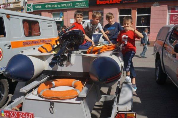 На Вічевому майдані представлена виставка рятувальних автомобілів та іншої техніки, за допомогою якої попереджуються смерті людей.