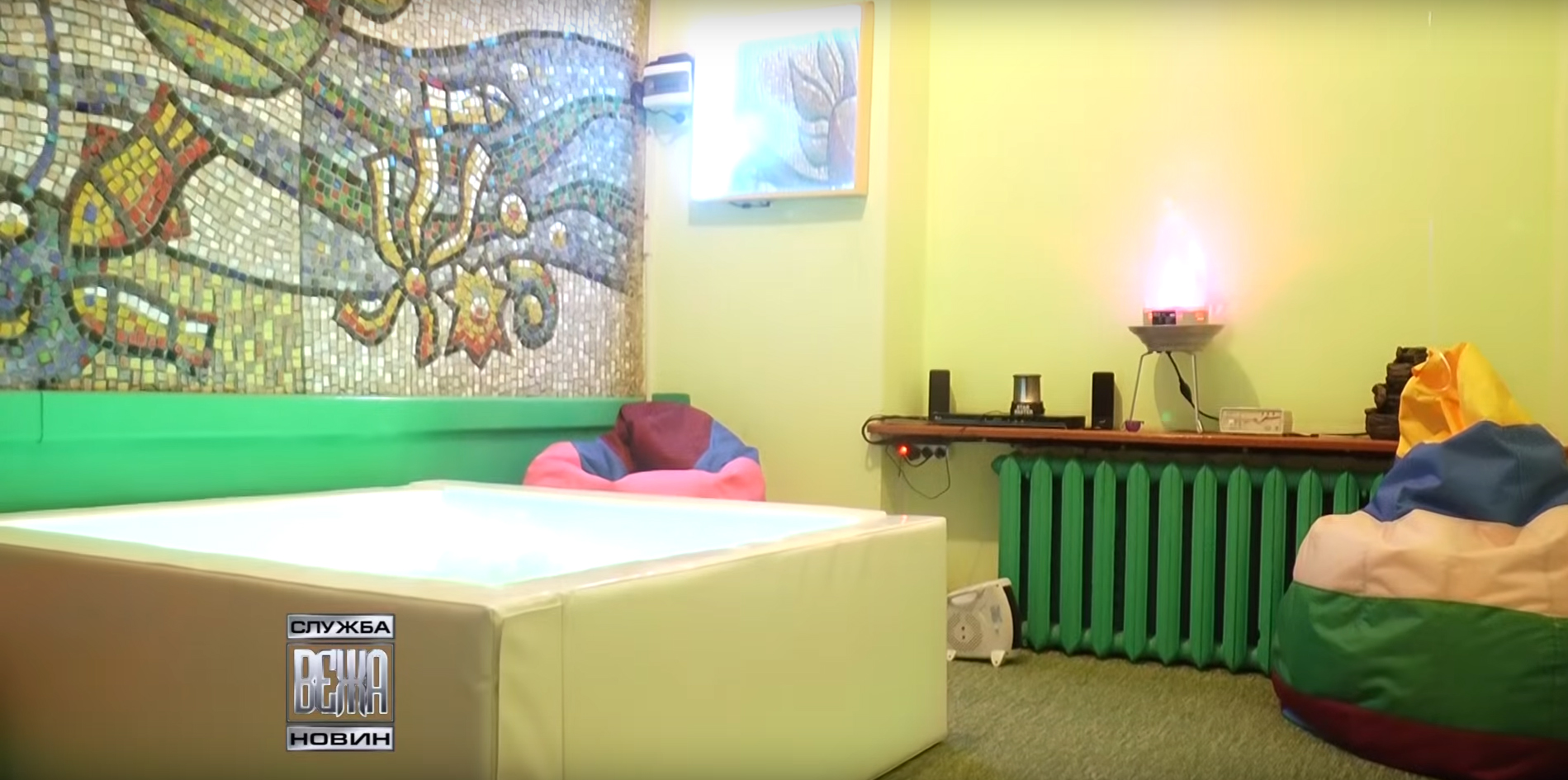 В кімнаті є сухий душ у вигляді кола з кольорових стрічок, басейн наповнений м’ягкими кульками, пристрій, який імітує вогонь і безпечне оптичне джеркало. Прості на вигляд речі насправді допомогають виявити найпотаємніші дитячі фобії, кажуть фахівці Центру, і розвіяти стрес чи депресію у ранньому віці. А за допомогою звукових сигналів та світлових ефектів в кімнаті сворюється затишна атмосфера. Тут дітки зможуть активно провести час чи просто розслабитися, передає ТРК ВЕЖА.