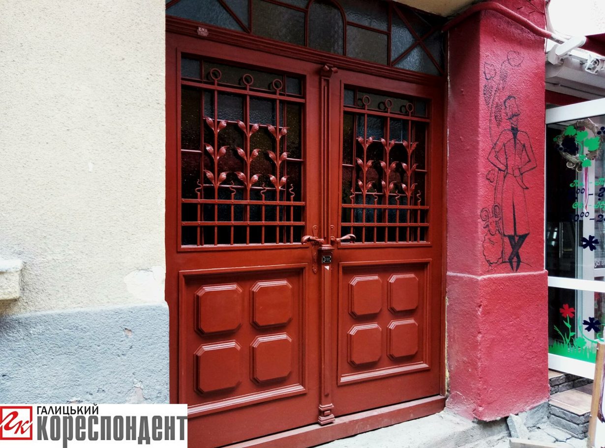 Яскраво-червоні двері ідеально вписуються у саму вуличку, і вдалося майже повністю повторити їхній попередній вигляд, незважаючи на поганий стан. Робота тривала майже півтора місяці, за цей час відреставрували самі двері, раму, вітражі та вікно біля входу, розповідає активістка Марія Козакевич.