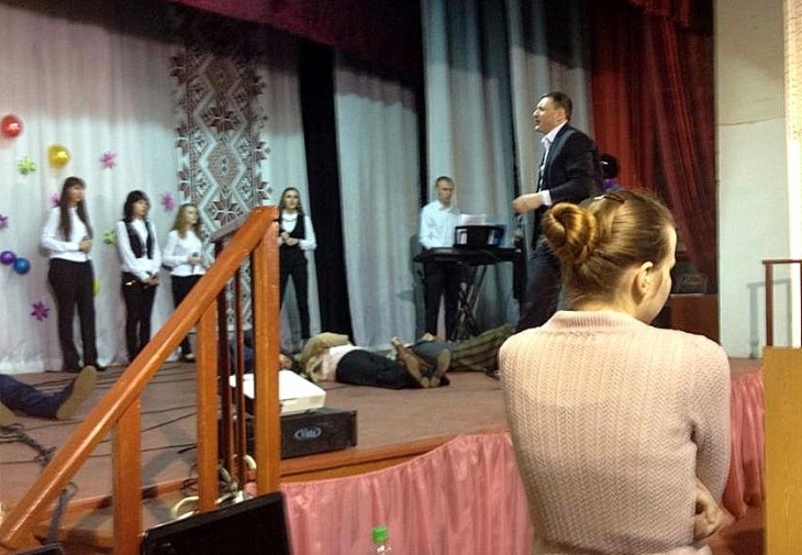 Перед входом до Будинку культури УТОГ запрошення на "служіння" роздавав чоловік характерної спортивної зовнішності у спортивному ж костюмі. У залі на сцені п’ятеро симпатичних дівчат під звуки диско славили Бога.