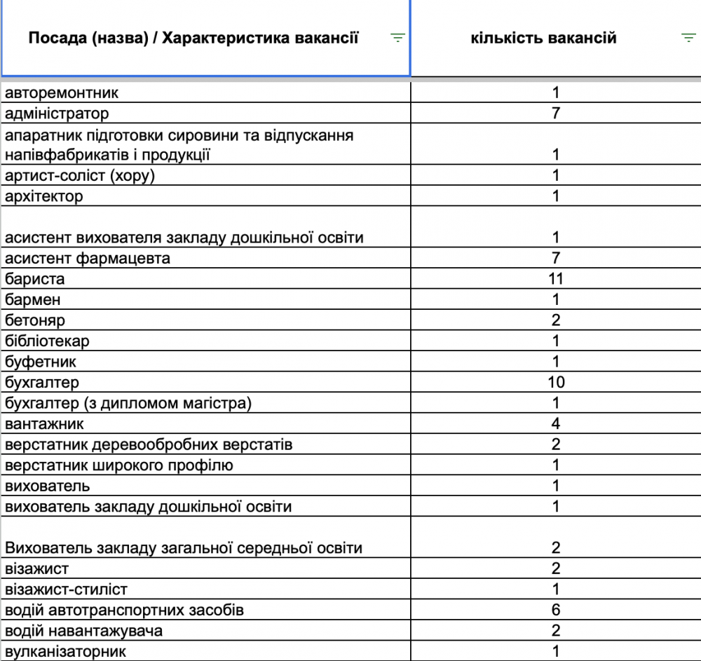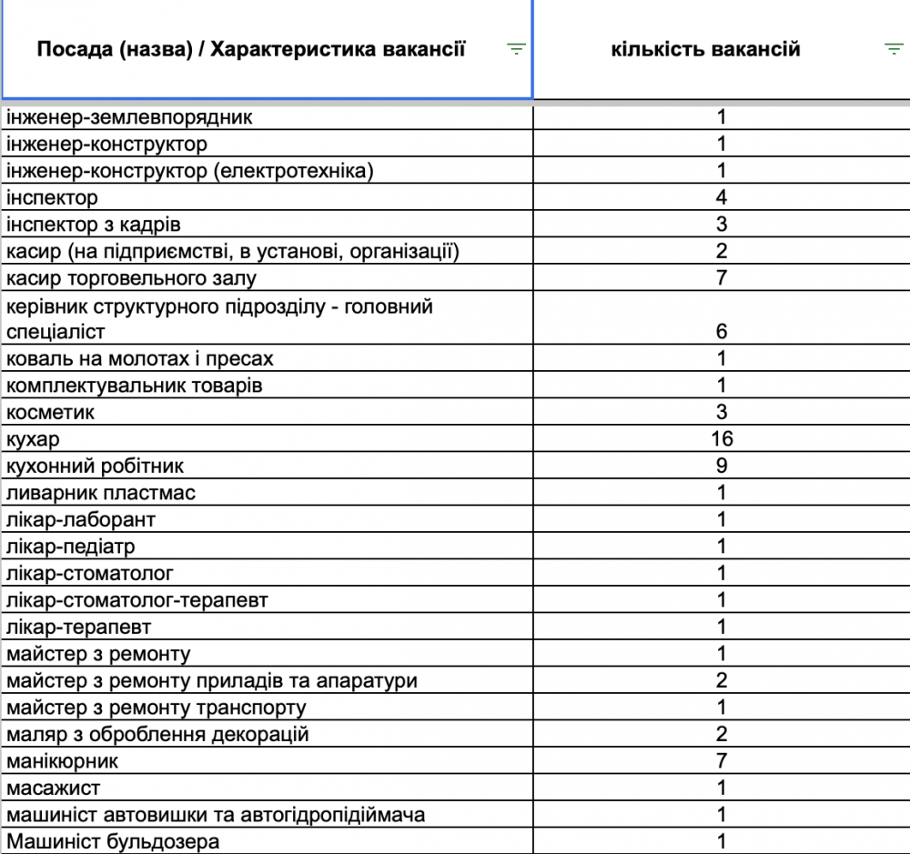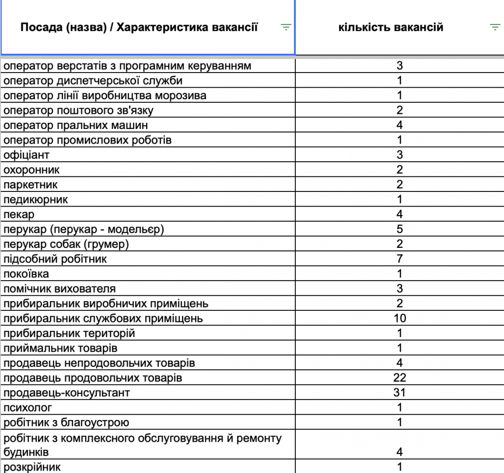 У переліку вакансій є пропозиції для сфери торгівлі та обслуговування (продавці, продавці-консультанти, кухарі, баристи, офіціанти), робітничих професій (швачки, укладальники-пакувальники, столярі, слюсарі, водії, електрики), а також для сфери освіти та охорони здоров’я (вихователі, вчителі, медичні сестри, лікарі).