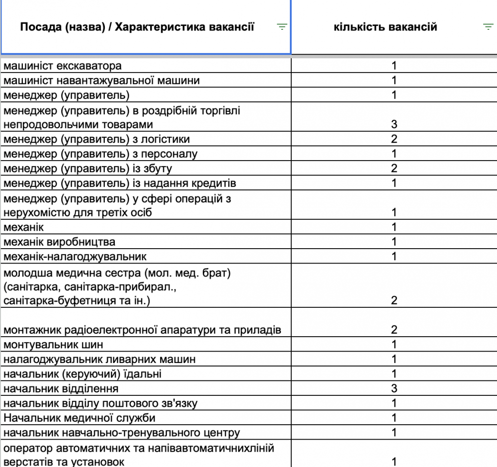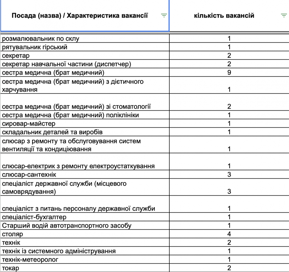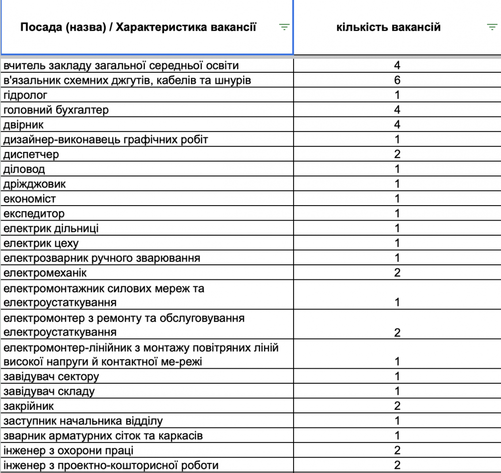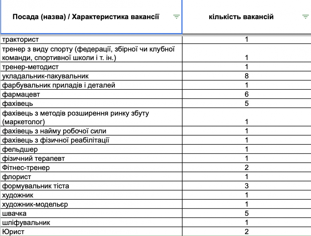 У переліку вакансій є пропозиції для сфери торгівлі та обслуговування (продавці, продавці-консультанти, кухарі, баристи, офіціанти), робітничих професій (швачки, укладальники-пакувальники, столярі, слюсарі, водії, електрики), а також для сфери освіти та охорони здоров’я (вихователі, вчителі, медичні сестри, лікарі).