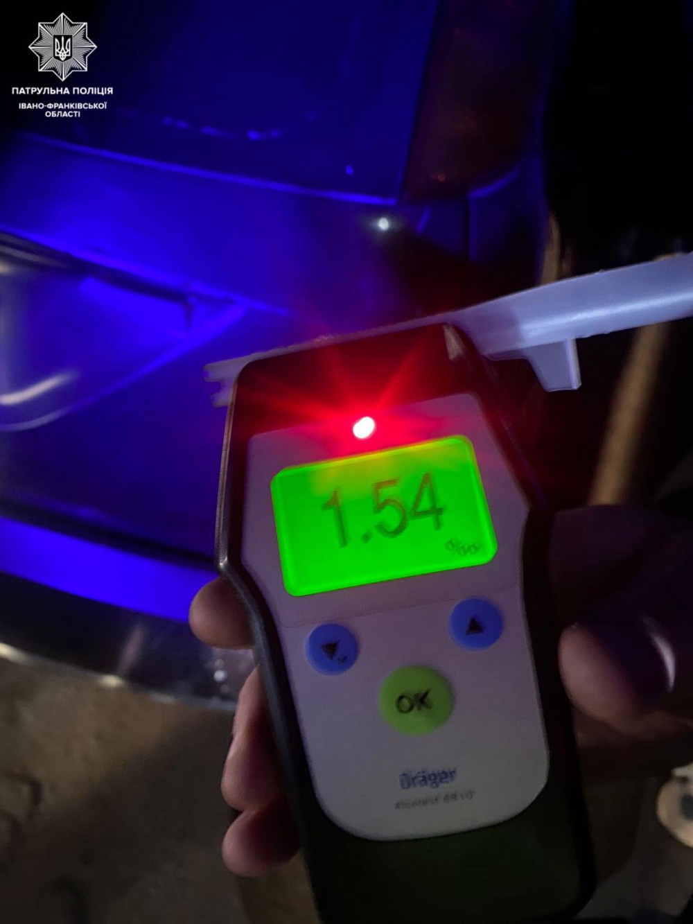 Під час спілкування з 25-річним водієм, поліцейські помітили в останнього ознаки сп'яніння. Чоловік пройшов освідування на місці. Результат — 1.54 проміле алкоголю у крові. Також, патрульні встановили, що керманич позбавлений права керування транспортним засобом.