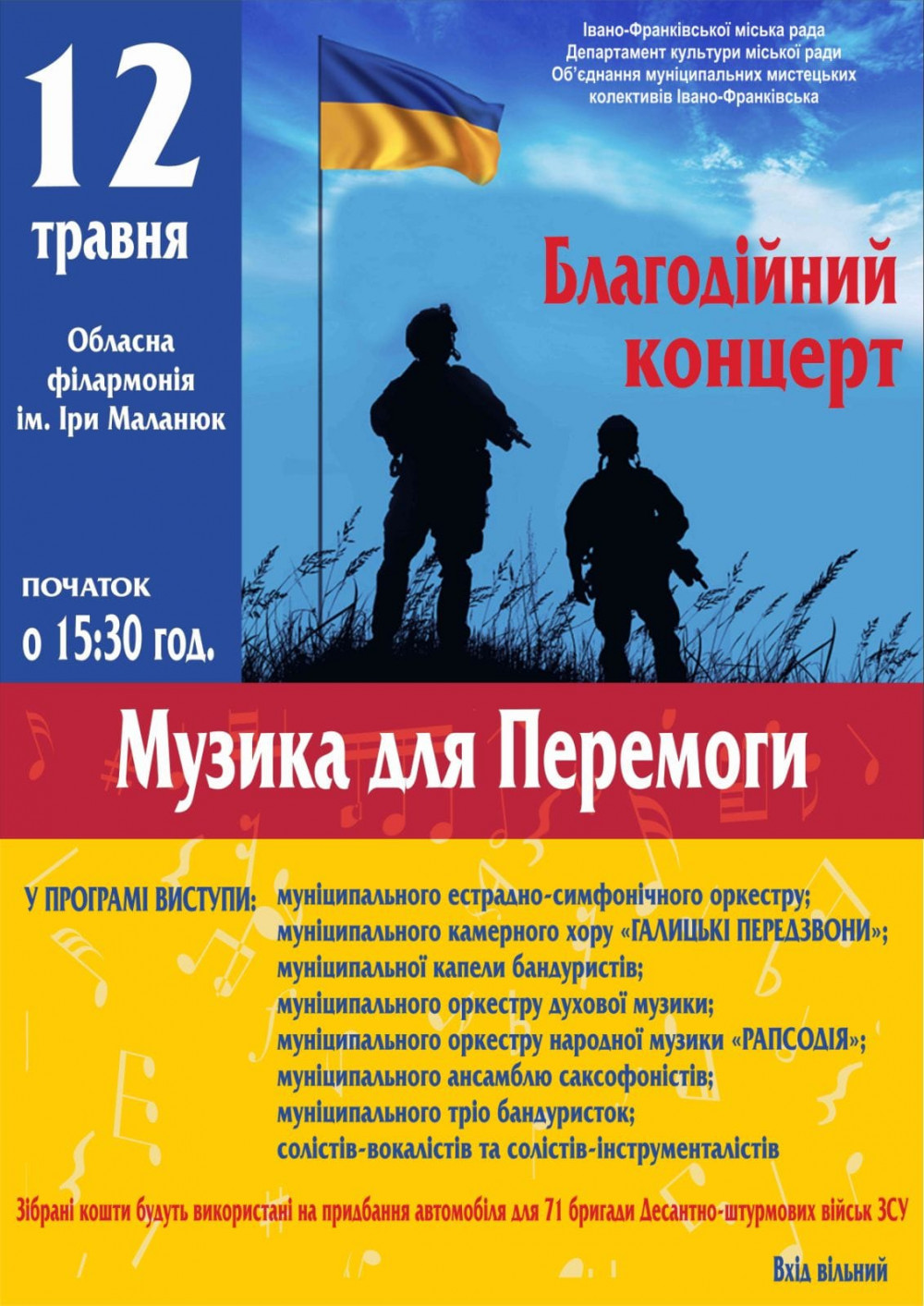 Благодійний концерт "Музика для перемоги" відбудеться у приміщенні Івано-Франківської обласної філармонії ім. І. Маланюк.
