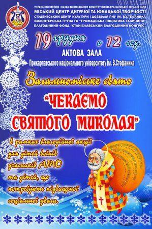 19 грудня о 12.00 у приміщенні Актової зали Прикарпатського національного університету ім. В.Стефаника відбудеться свято за участю колективів Міського центру дитячої та юнацької творчості під назвою „Чекаємо святого Миколая” в рамках благодійної акції для дітей воїнів АТО та дітей, що потребують підвищеної соціальної уваги.