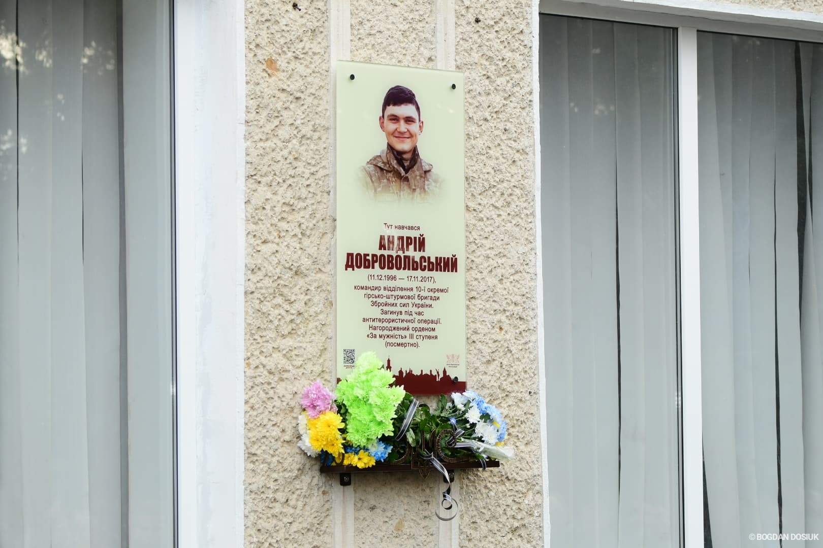Ще один фасад поповнився іменем Українського Героя. Анотаційну дошку загиблому учаснику АТО Андрію Добровольському встановили в рамках програми «Івано-Франківськ – місто Героїв» на фасаді професійного політехнічного ліцею.
