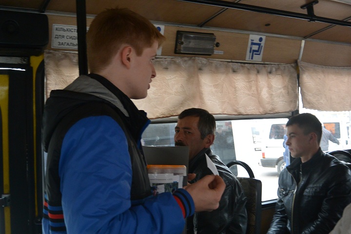 Хлопець назвав декілька прізвищ, для яких нібито збирає гроші, і пройшовся зі скринькою по салону. За його словами, у нього є усі документи та навіть дозвіл від міськвиконкому – при собі мав папку з ксерокопіями паперів. Однак сфотографувати документи не дозволив. Натомість запросив до офісу Благодійного фонду та дав візитку.