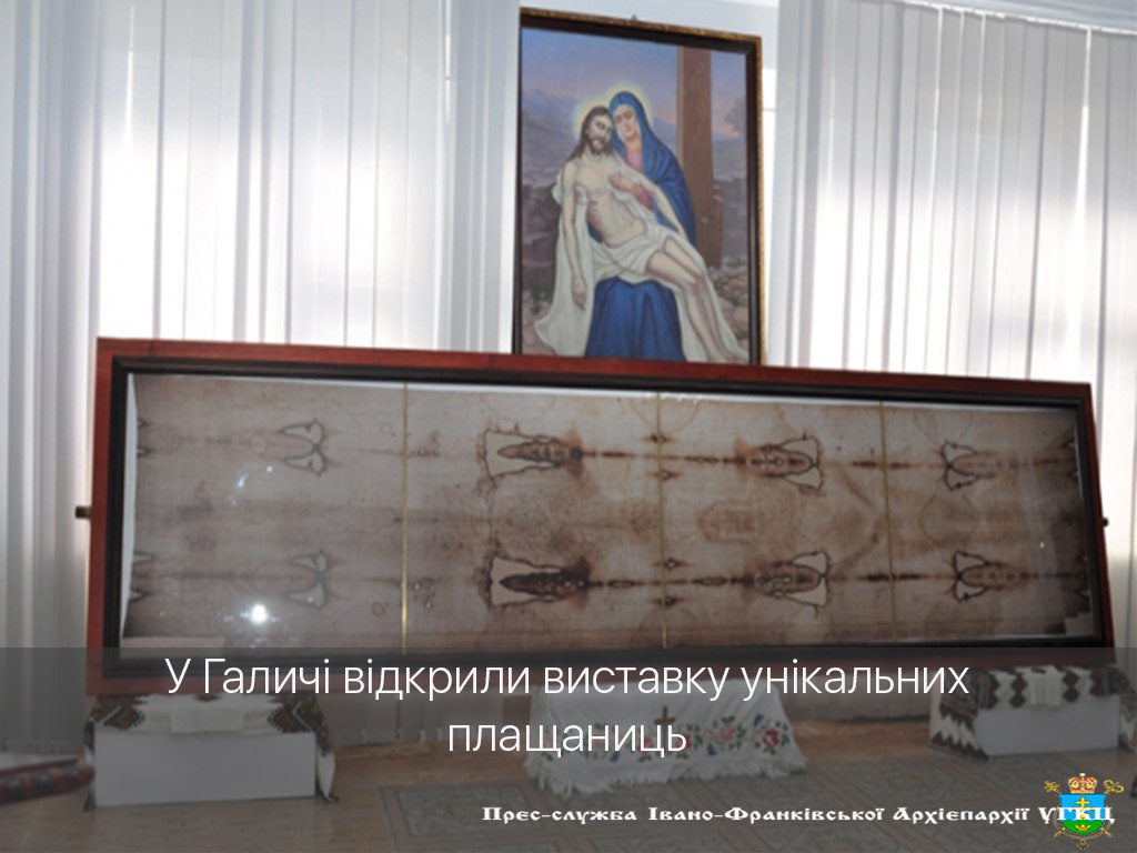 Головним експонатом виставки є чотирьох метрове полотнище копії Туринської плащаниці. За це особлива вдячність о. Никодиму Гуралюку ЧСВВ ігумену Святоуспенського монастиря у Погоні, який особисто прибув на презентацію. Про наукові дослідженя «П’ятого євангелія», як називають Туринську плащаницю, розповів доктор філософії Ігор Коваль.