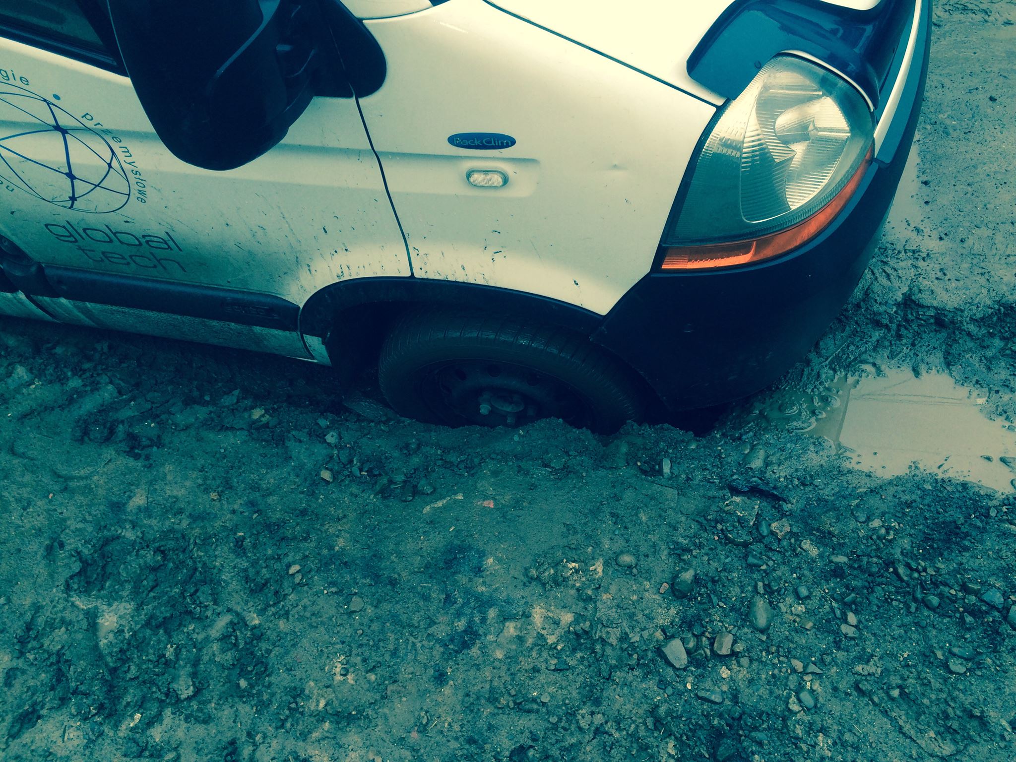 Машина провалилась колесом на дорозі, де нещадавно прокладали каналізацію.