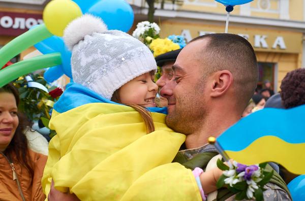 На зустріч з героями люди принесли квіти, повітряні кульки, листівки та синьо-жовту символіку.
