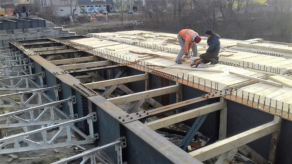 Працівники монтують перший прольот балки залізобетонних конструкцій і на третьому влаштовують опалубку під бетонування залізобетонної монолітної плити, йдеться в прес-службі САД.