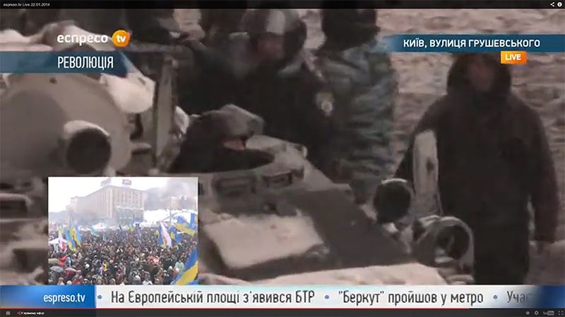 У міліції з'явилося підкріплення - бронетранспортер приєднався до силовиків та припаркувався позаду. Ймовірно, бронетранспортер таранитиме стінку євромайданівців.