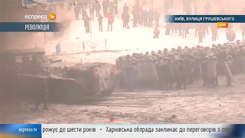 Правоохоронці відтіснили людей із барикад та вишикувався стінкою. Загалом на вулиці Грушевського зібралося більше 2 тисяч спецпризначенців.