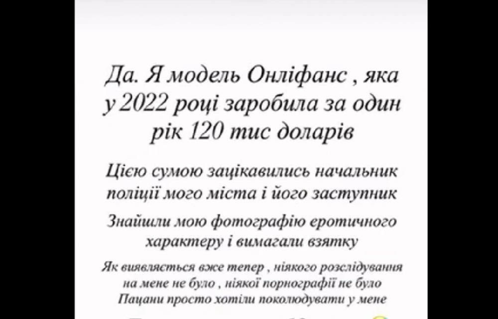 "Я модель Онліфанс, яка у 2022 році заробила за один рік 120 тис. доларів. Цією сумою зацікавились начальник поліції мого міста і його заступник. Знайшли мою фотографію еротичного характеру і вимагали взятку", - розповіла модель.