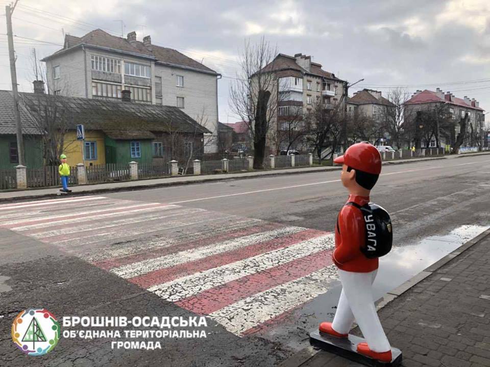 Вони мають вигляд школярів, які намагаються перейти дорогу. На наплічнику великими літерами написано "Увага". Таким чином перехід став значно безпечнішим, інформує прес-служба Брошнів-осадської ОТГ.