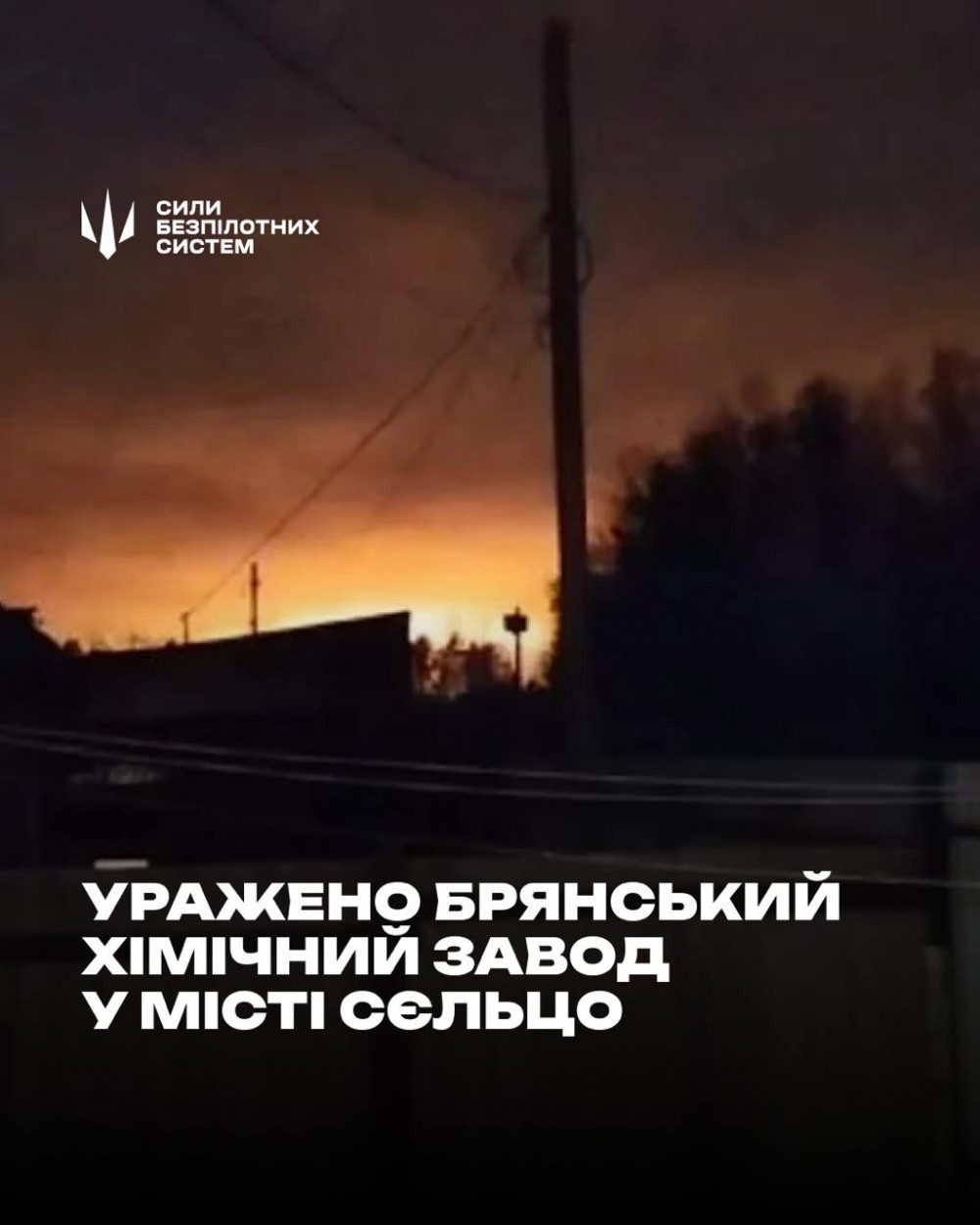 Підрозділи Сил безпілотних систем у взаємодії з іншими складовими Сил оборони України завдали точного удару по Брянському хімічному заводу в місті Сєльцо — стратегічному об’єкту військово-промислового комплексу рф.