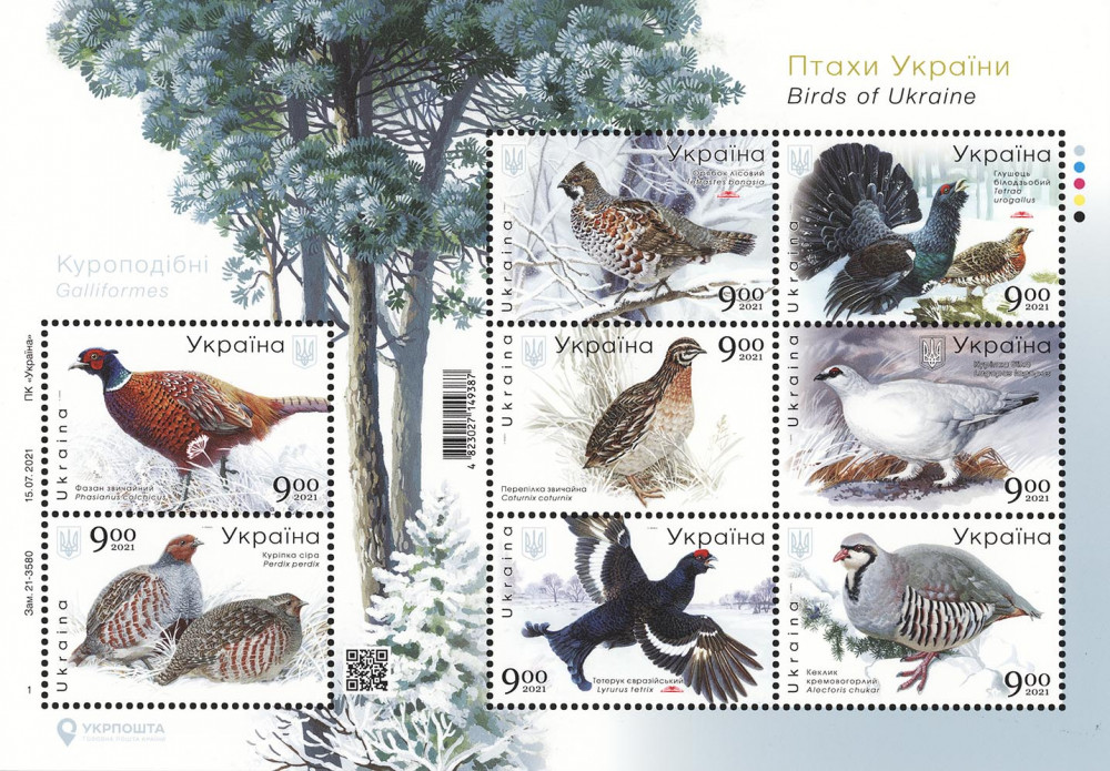 На 8 нових марках випуску «Птахи України. Куроподібні» зображені «Орябок лісовий Tetrastes bonasia», «Глушець білодзьобий Tetrao urogallus», «Фазан звичайний Phasianus colchicus», «Перепілка звичайна Coturnix coturnix», «Куріпка біла Lagopus lagopus», «Куріпка сіра Perdix perdix», «Тетерук євразійський Lyrurus tetrix», «Кеклик кремовогорлий Alectoris chukar».