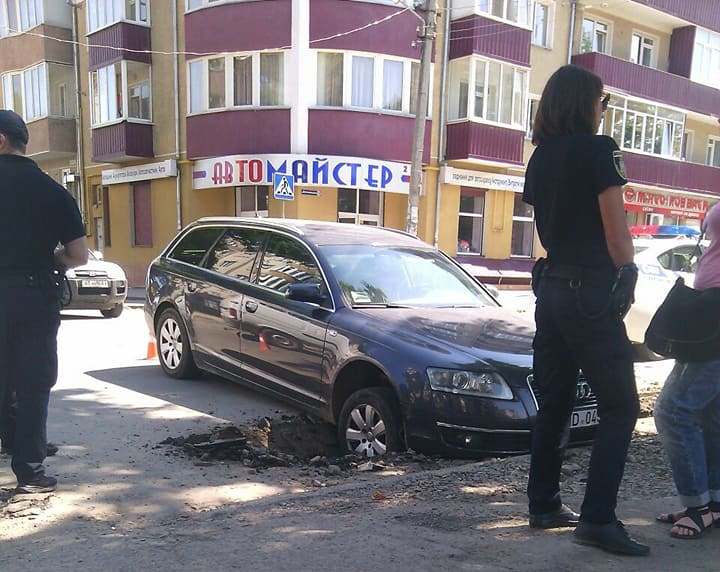 Біля магазину "Автомайстер" Ауді потрапила в яму, яку вирили комунальники. Автівка провалилась у "пастку" передніми колесами.