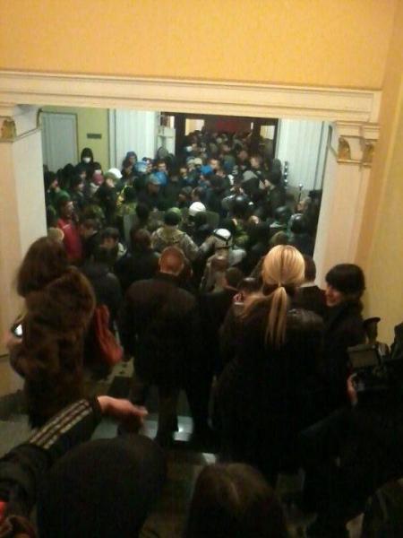 Зрозумівши, що ці заклики не діють, розгніваний натовп пішов на штурм . Їх стримували силовики зі щитами. Та люди вже побили всі таблички з написами «Управління СБУ» та «УМВС в Івано-Франківській області»