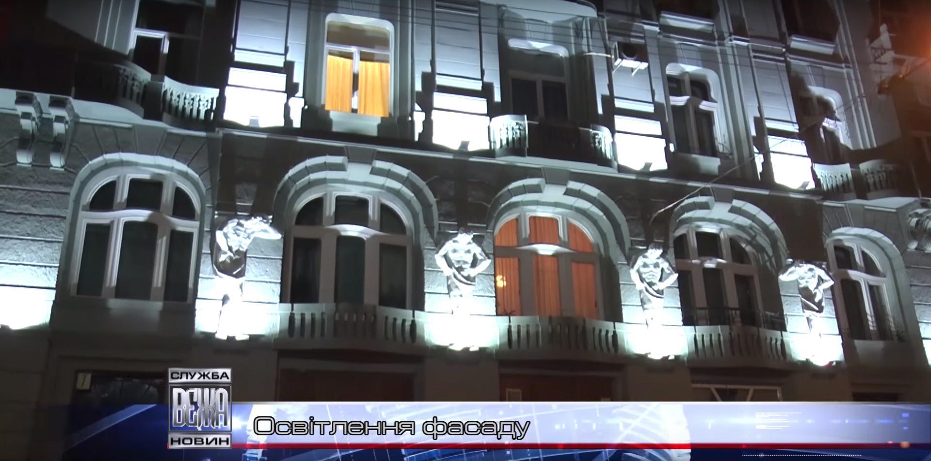 Вночі будівля підсвічується ліхтарями. Фахівці “Міськсвітла” змонтували тут 14 світлодіодних ламп, які розташовані по периметру фасаду. Половину ліхтарів розмістили поблизу скульптур атлантів. Відак світлові промені підсилюють архітектурну стилістику будинку, кажуть комунальники. Це – їхній перший проект освітлення фасаду. Його вартість близько 30-ти тисяч гривень, інформує Вежа