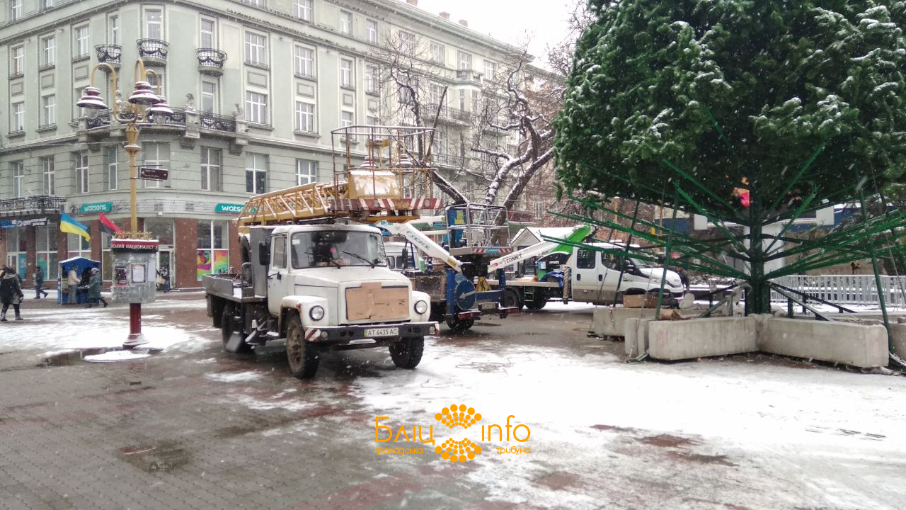 З самого ранку за допомогою крану з новорічної красуні зняли освітлення. Також комунальники демонтували огорожу, інформує Бліц-інфо.