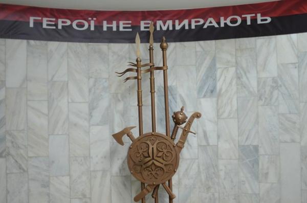Символ "Герої не вмирають" представляє собою об'ємно-просторову композицію, котра виконана з використанням козацької символіки.