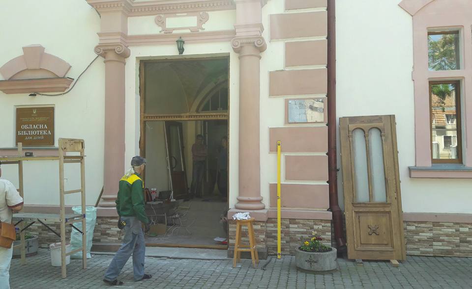 Зокрема жінка виклала фотографії, як майстри встановили відреставровані двері замість пластикових, в обласній бібліотеці для дітей.
