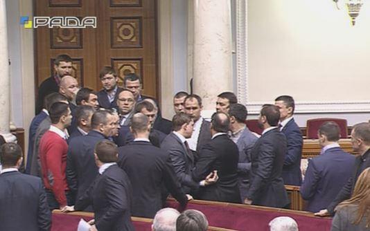Зокрема,  депутати-"радикали" під вигуки "Тушку - геть!" намагалися побитися з Мельничуком, вчинили штовханину, в результаті якої була розвалена конструкція на прес-поінті парламенту.
