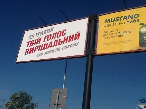 Втім, в Івано-Франківську не всі кандидати законослухняно «замовкли». У місті з’явилися замасковані під соціальну рекламу борди, які виразно нагадують про одного з претендентів на пост Президента – Петра Порошенка. На борді під написом «Твій голос вирішальний» розміщено передвиборче гасло Порошенка «Жити по-новому».