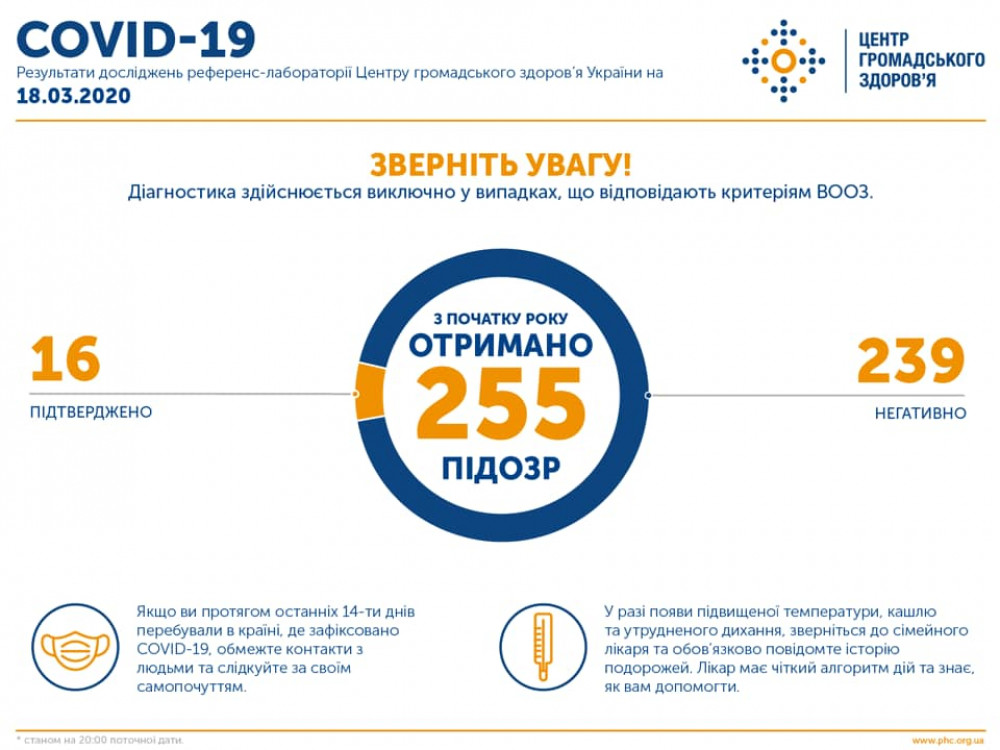 Таку інформацію станом на 22:00 18 березня повідомив Центр громадського здоров’я України.