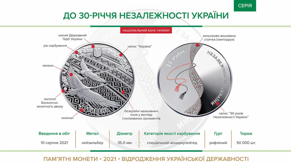 Національний банк з 10 серпня вводить в обіг пам'ятну монету "До 30-річчя незалежності України" номіналом 5 грн.