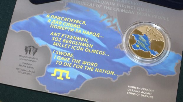 На монеті, яка вийшла тиражем 35 тисяч штук, викорбоване зібрання кримських татар та рядки гімну.