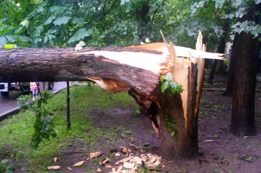 Також дерево впало на електропровода та проїжджу частину дороги Національної Гвардії. Працівники рятувального відділення за допомогою бензопил розрізали дерево та очистили проїжджу частину дороги.