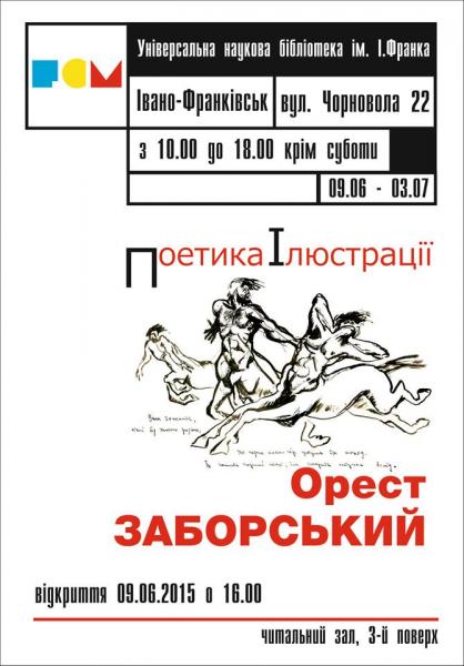 9 червня 2015 року о 16.00 в читальному залі Обласної універсальної бібліотеки ім. І.Франка (вул. Чорновола,22, 3 поверх) відбудеться відкриття виставки рисунку Ореста Заборського «Поетика Ілюстрації».