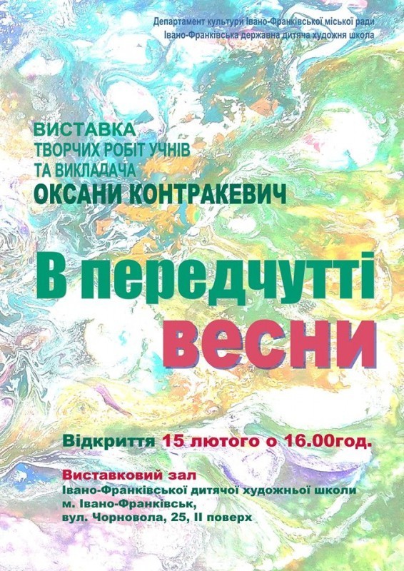 15 лютого о 16.00 год. вул. Чорновола, 25, ІІ поверх, виставковий зал дитячої художньої школи, відбудеться відкриття виставки творчих робіт викладача художньої школи Оксани Контракевич та її учнів "В передчутті весни".
