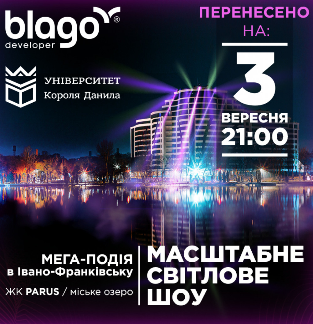В перший тиждень осені, 3 вересня, провідна будівельна компанія Івано-Франківська blago developer організовує безкоштовну вечірку на міському озері. Програмою свята передбачене яскраве лазерне шоу та сучасна музика у виконанні діджея. Спец. гості заходу - відомі місцеві блогери.